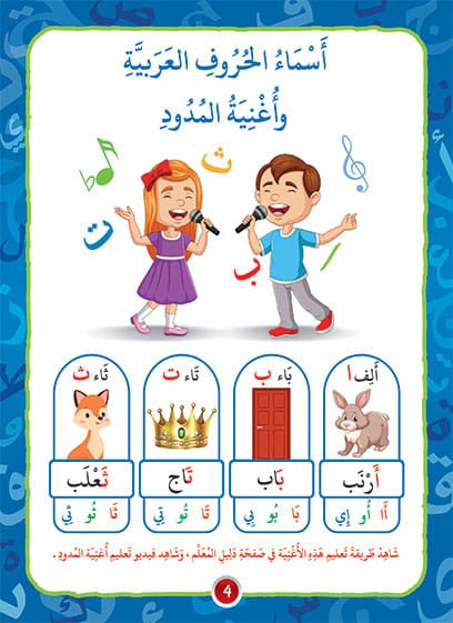 يبدأُ الكتابُ بأغنيةِ المدودِ لتعليمِ اللّفظِ السّليمِ للحروفِ بحركاتها البسيطةِ ومع المدودِ.